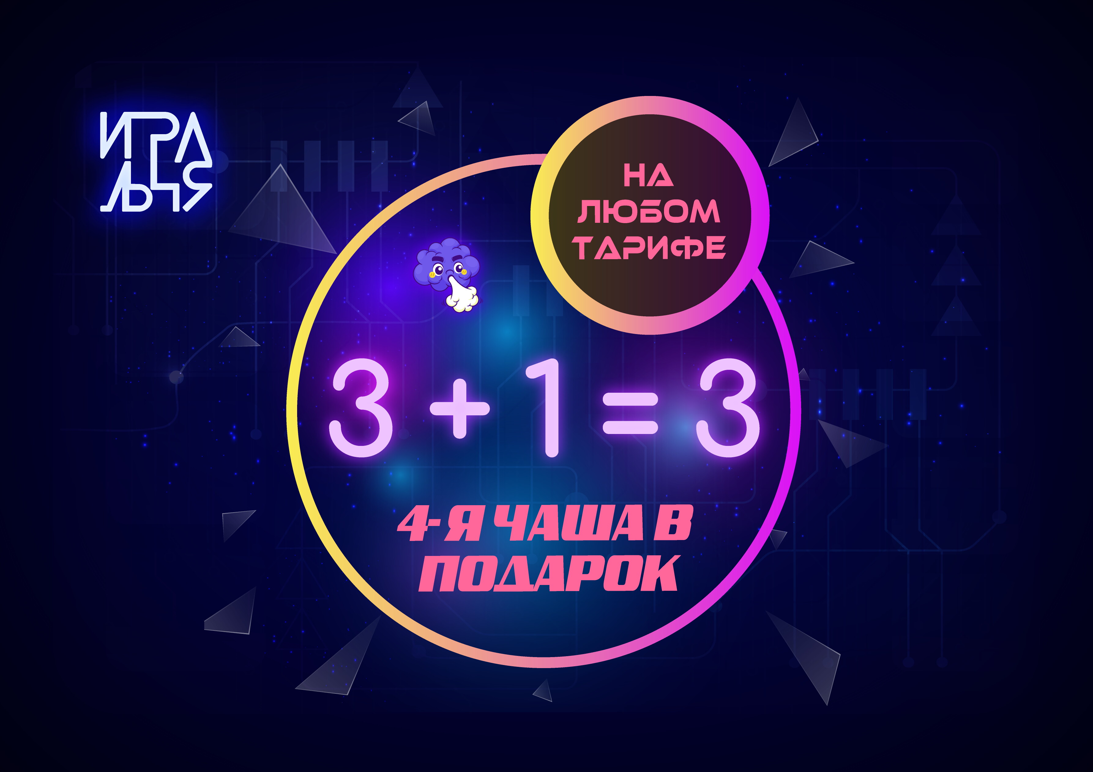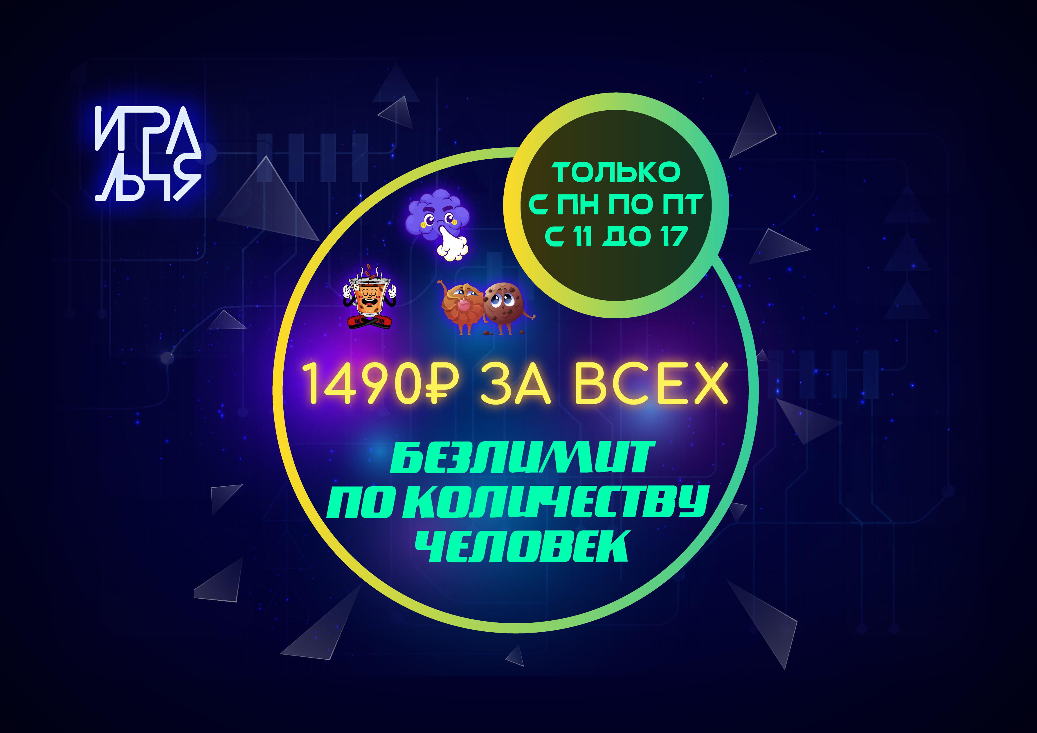 All InclusiveТариф предоставляется в пакетных вариантах. В стоимость тарифа антикафе входит: Базовый кальян на Chabacco, Chaba Отдельная комната с 4K TV или проектором, PlayStation 5 Замена кальяна каждый час по вашему желанию Настольные игры На выбор чай в ассортименте/кофе и вкуснейшее печенье (пополнение и замена раз в час по желанию) Онлайн-кинотеатр Тариф действует только от 2-х человек. 480 руб./чел 1-й час, далее - 8руб/мин/чел Количество кальянов, входящих в стоимость тарифа: на 1-2 чел - 1 кальян/час на 3-4 чел - 2 кальяна/час на 5-6 чел - 3 кальяна/час далее на каждые +2 человека +1 кальян/час Премиум кальян +800-900 руб./чашу. Кол-во чаш и кальянов не ограничено. *В заведении взимается пробковый сбор на алкоголь - 200руб/бут. (При себе необходимо иметь чек о приобретении алкоголя)от 480 руб.